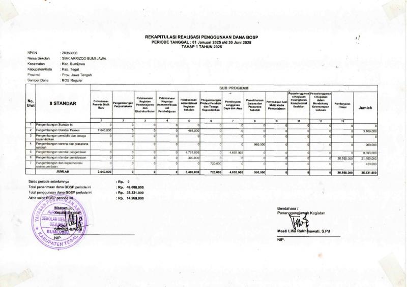 Fri, 07/25/2025 - 12:41pm by admin Rekapitulasi Realisasi Penggunaan Dana BOSP Tahap I Tahun 2025 SMK Arrizqo Bumijawa Bisa download PDF di sini. Laporan